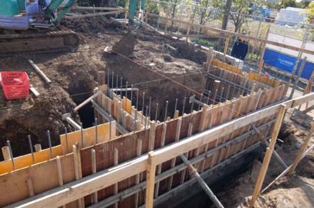 雨が続き、型枠の組み直しなどもあり、コンクリートの打設が遅れました。